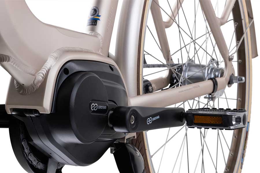 EGOING centermotorer. En centermotor är integrerad med elcykelns pedaler vilket innebär att el-assistansen aktiveras när du trampar. För trygg och säker cykling har EGOING centermotor mjuka och dynamiska startegenskaper och kraftfull assistans upp till 25 km/h i all typ av terräng. Du ställer själv in hur mycket hjälp du vill ha och eftersom dina tramptag styr el-assistansen blir känslan naturlig och jämn. Du kan alltid lägga till egen kraft på pedalerna när det går kraftigt uppför eller när du cyklar med extra last. Att cykla med centermotor är som att alltid cykla med superkrafter i benen!