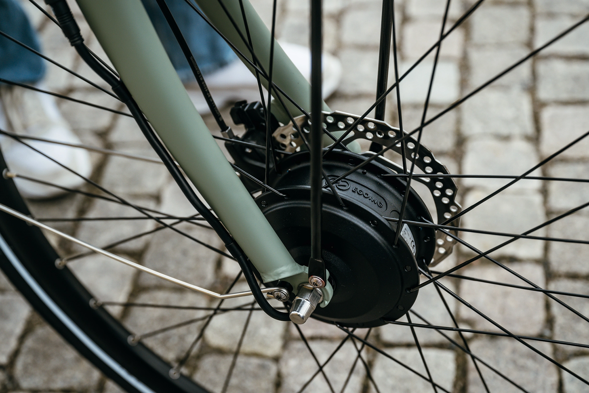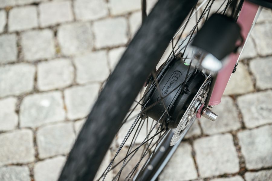 EGOING framhjulsmotor. En framhjulsmotor sitter i framhjulet och driver elcykeln oberoende av kraften i dina tramptag upp till 25 km/h. Du måste trampa för att aktivera el-assistansen och få den behagliga känslan av att bli dragen fram längst vägarna. En elcykel med framhjulsmotor är perfekt för dig som vill ha kraft hela vägen i flackare terräng utan extra vikt.
